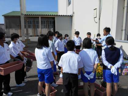 放課後、環境委員が生徒玄関前で花苗をプランターに植えました。