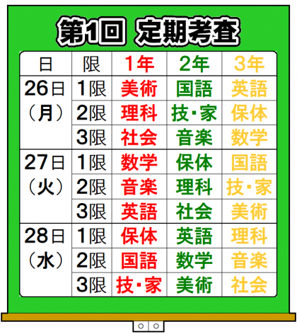 明後日26日(月)から、「第1回 定期考査」が始まります。