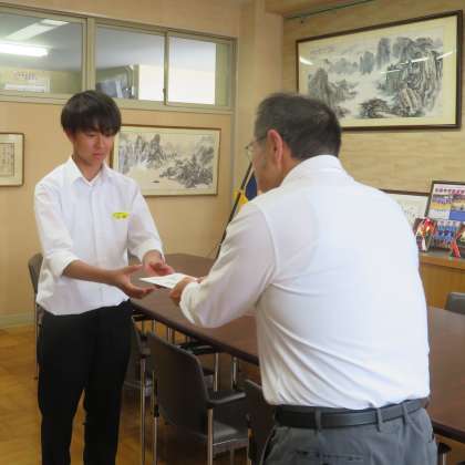 北信越クラブユースサッカー選手権大会・激励会 公開日 2023/06/29 更新日 2023/06/29 山室中学校のページ 6月29日(木) 13:10 「第35回 北信越クラブユースサッカー選手権(U-15)大会」に出場したサッカー選手の激励会を校長室で行いました。 後援会、PTAからの激励金を校長先生から渡していただきました。