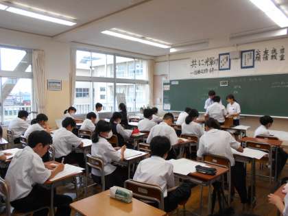 1年・授業風景・その1 公開日 2023/06/30 更新日 2023/06/30 1学年 6月30日(金) 4限 5教科の授業では、初めての定期考査の答案が返され、生徒たちは解説を熱心に聞いたり、見直しをしたりしています。 体育館では、蒸し暑さを吹き飛ばすような、元気な声が響いています。 (写真 上:1年1組 数学「定期考査の解説」) (写真 中:1年2組 英語「定期考査の解説」) (写真 下:1年3組 体育「バレーボール」)