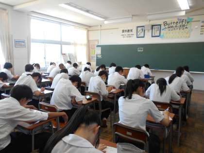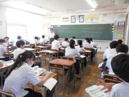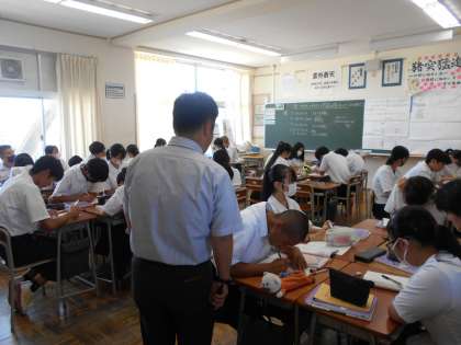 3年・授業風景・その1 公開日 2023/07/04 更新日 2023/07/04 3学年 7月4日(火) 5限 対話を楽しみながら生物の学習をするクラス、黙々とまとめのプリントや課題に取り組むクラスと、3クラスともそれぞれに意欲的な姿が印象的です。 (写真 上:3年1組 理科「無性生殖とはどのようなものだろう」) (写真 中:3年2組 数学「根号を含む式の計算 平行根の利用」) (写真 下:3年3組 数学「方程式を利用した問題を解決しよう」)
