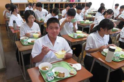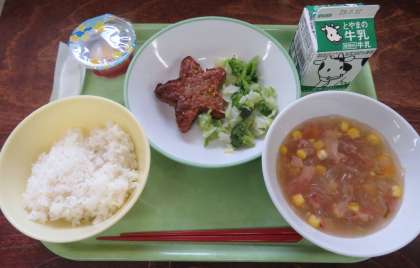 今日の献立は「ごはん・牛乳・星形ハンバーグ・添え野菜・天の川スープ・七夕ゼリー」で、七夕スペシャルメニューでした。