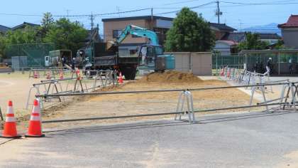 今日(7/6)の工事速報 公開日 2023/07/06 更新日 2023/07/06 山室中学校のページ 7月6日(木) 10:00 テニスコート横に、南門から入る幅5mの道路をつくるために整地しています。