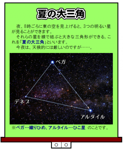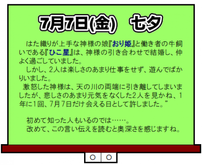 今日は、「七夕」ですが…… 公開日 2023/07/07 更新日 2023/07/07 山室中学校のページ 7月7日(金) 今日は、「七夕(たなばた)」です。 といっても、夕方からくもっていくので、星は見られないかも……。