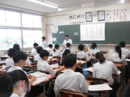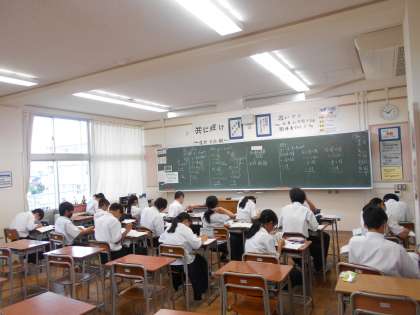1年・授業風景・その3 公開日 2023/07/10 更新日 2023/07/10 1学年 7月10日(月) 5限 蒸し暑い一日ですが、午後の授業に入りました。 黙々と計算問題を問いたり、スピーチの評価を丁寧に書き込んだり……。 1年生は午後も元気です。 (写真 上:1年3組 数学「代入と式の値」) (写真 中:1年3組 数学「文字を含む式の加法・減法をしよう」) (写真 下:1年5組 国語「スピーチ会」)