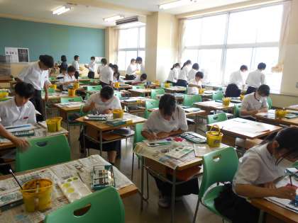 四苦八句といった身近な言葉から仏教について学んだり、クロムブックを使って分類をしたり、丁寧に色塗りをしたりしている場面です。