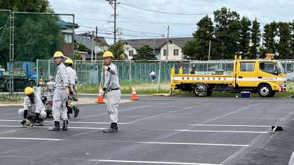 仮の駐輪場に、自転車5台分ずつの白線が引かれました。