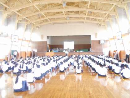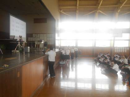 1年・学年レクリエーション・その1 公開日 2023/07/18 更新日 2023/07/18 1学年 7月18日(火) 1,2限 1年生は、学年協議会主催の学年レクリエーションを行いました。 曲当てクイズや山中マニアッククイズで盛り上がっています。 司会・運営は各学年代表が進行しました。