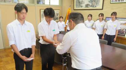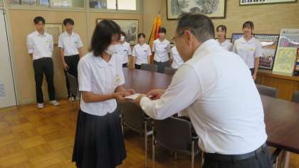 後援会、PTAからの激励金を校長先生から渡していただきました。