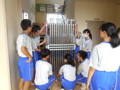 7月25日(火)の部活動・その2 公開日 2023/07/25 更新日 2023/07/25 部活動 7月25日(火) 14:10 吹奏楽部が楽器を運搬しています。 「チャイム」という大きな楽器です。 どうやって運んでいこうか、みんなで考え中です。