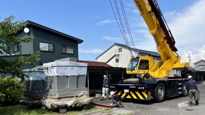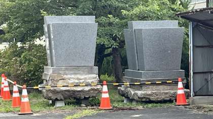正門の門柱が校舎北側に運ばれました。(写真:上)