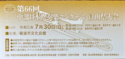 吹奏楽部は、明日30日(日)「第66回 中部日本吹奏楽コンクール 富山県大会」に出場します。(本番は10:02〜10:14です。)