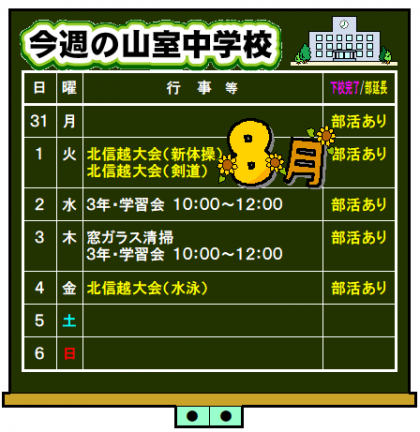 今週は、北信越大会があり、新体操部、剣道部、水泳部が出場します。
