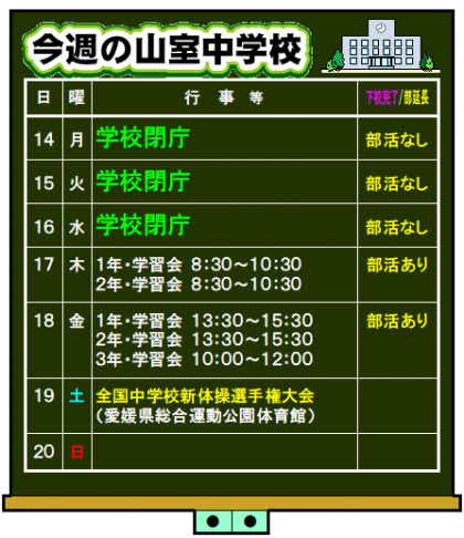 ♪今週の山室中学校♪ 公開日 2023/08/13 更新日 2023/08/13 お知らせ 8月13日(日) 22:00 夏休みもあと2週間になりました。 夏休みの課題は順調に仕上がっていますか? そろそろ学校モードに切り替える準備をしましょう!