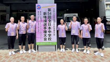全中・新体操部・その7 公開日 2023/08/19 更新日 2023/08/19 部活動 8月19日(土) 11:25 新体操部は、本番の演技を披露しました。(本番は撮影できません。) 全国の大舞台でチームベストスコアを出せました。 3年生は笑顔で演技を終えることができました。 演技終了後のやり切ったメンバーの写真です。 みんなの笑顔が、全てを物語ってくれている気がします。 今までたくさんの応援、声援、本当にありがとうございました!