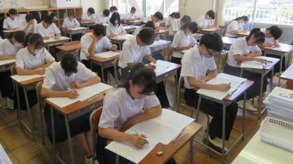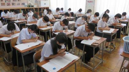 3年・第2回 実力テスト 公開日 2023/08/21 更新日 2023/08/21 3学年 8月21日(月) 1限 国語 3年の学年登校日は、「第2回 実力テスト」です。 (写真 上:3年1組 中:3年3組 下:3年5組) 手応えはどうだったでしょうか?