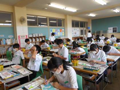 (写真 上:2年4組 美術「牛乳パックデザイン」)