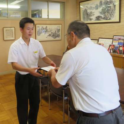 ジュニアオリンピックカップ・激励会 公開日 2023/09/01 更新日 2023/09/01 部活動 9月1日(金) 13:05 「第53回 JOC(ジュニアオリンピックカップ)U16競技大会」に出場する陸上競技部の選手の激励会を校長室で行いました。 後援会、PTAからの激励金を校長先生から渡していただきました。