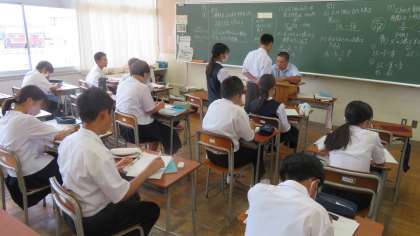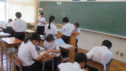 1年・授業風景 公開日 2023/09/05 更新日 2023/09/05 1学年 9月5日(火) 1限 気温は29度、天気はくもり。 気温は少し低くなりましたが、湿度が高いので、かなりジメジメしています。 でも、エアコンがあるので、教室内は快適です。 (写真 上:1年1組 英語の授業) (写真 中、下 1年2組 数学・少人数の授業)