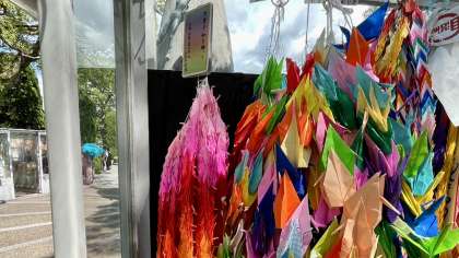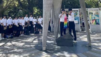 3年・修学旅行・1日目・その10 公開日 2023/09/06 更新日 2023/09/06 3学年 9月6日(水) 13:50 原爆の子の像の前で、セレモニーを行いました。 そして、みんなでつくった千羽鶴を納しました。