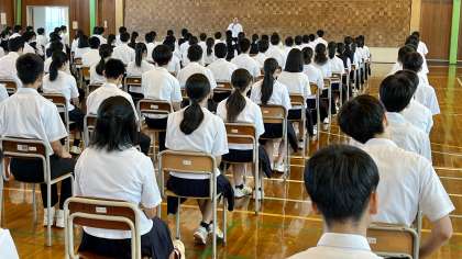 3年・修学旅行・解団式 公開日 2023/09/11 更新日 2023/09/11 3学年 9月11日(月) 1限 3年生は、体育館で、修学旅行・解団式を行いました。 (写真 上:生徒代表の挨拶 中、下:校長先生のお話) このあと、教室に戻り、事後学習を始めました。
