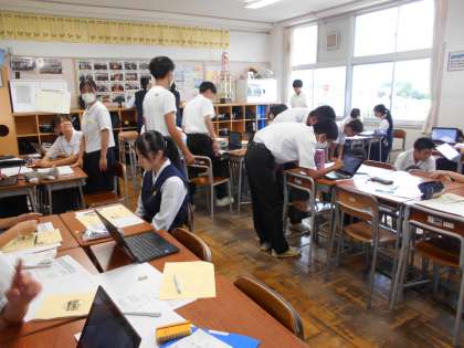 3年・修学旅行・事後学習・その1 公開日 2023/09/11 更新日 2023/09/11 3学年 9月11日(月) 6限 3年生は、5限に続き、6限も総合的な学習の時間です。 6日(水)〜8日(金)まで行われた修学旅行のまとめを行っています。 クロムブックや模造紙等を使い、協力し合って仕上げています。 (写真 上:3年1組 中:3年2組 下:3年3組)