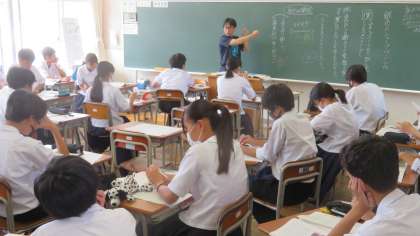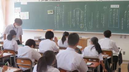 1年・授業風景 公開日 2023/09/12 更新日 2023/09/12 1学年 9月12日(火) 2限 体調も天候もスッキリしませんが、…… 授業にしっかり向き合っています! (写真 上:1年1組 道徳「銀色のシャープペンシル」) 教育実習生・渡部先生の授業) (写真 中:1年2組 英語「Unit6」) (写真 下:1年4組 国語「大人になれなかった弟たち…」)