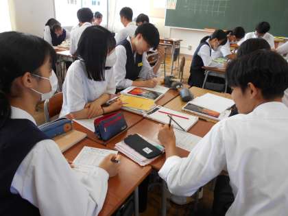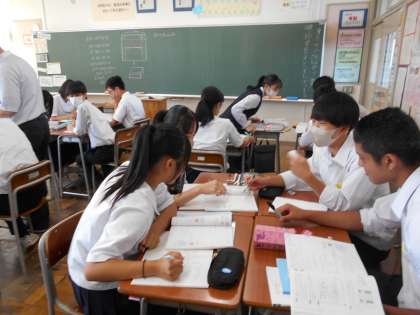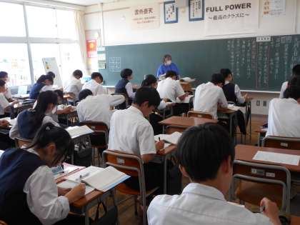 3年・授業風景・その1 公開日 2023/09/12 更新日 2023/09/12 3学年 9月12日(火) 3限 修学旅行を終え、3年生は授業にもさらに集中するようになっています。 どのクラスも、楽しく学習を進めています。 (写真 上:3年1組 理科「遺伝のしくみ」) (写真 中:3年2組 数学「2次方程式の利用」) (写真 下・3年4組 国語「挨拶」)