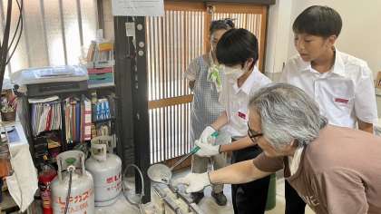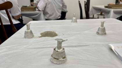 9月19日(火) 鋳物工房利三郎で、錫を溶かし型に流し込みます。 みんな集中してます。