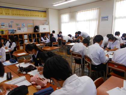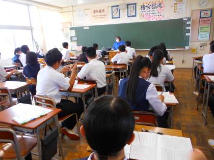 3年・授業風景・その1 公開日 2023/09/20 更新日 2023/09/20 3学年 9月20日(水) 5限 午後最初の3年生の授業です。 教え合いながら学習を進めたり、返却されたテストをもとに振り返りをしたりなど、授業の時間を大切にして過ごしています。 (写真 上:3年1組 数学「2次方程式」) (写真 中:3年2組 英語「心をこめて読んだり聞いたりしよう」) (写真 下:3年3組 国語「テスト直し」)