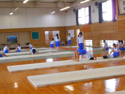 (写真 下:3年4、5組女子 体育「マット運動」)