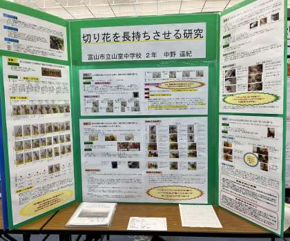 2年・中野さんの作品「切り花を長持ちさせる研究」(写真:上)が、金賞を受賞し、県の科学展覧会に出品されることになります。