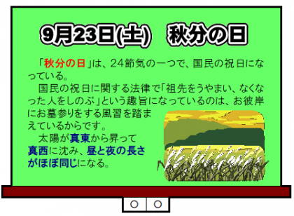 今日は、「秋分の日」です! 公開日 2023/09/23 更新日 2023/09/23 山室中学校のページ 9月23日(土) 13:30 気温は21度、天気はくもり、雨がポツポツ降っています。 今日は「秋分の日」ですが、「統一学校公開日」です。 昼と夜の長さがほぼ同じと言いますが、…… 富山の日の出は5:39、日の入りは17:48です。 ということは、…… 昼の方がちょっと長いですね! (と言っても、この天気では分かりづらいですが、……)