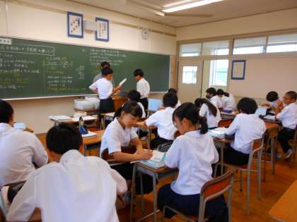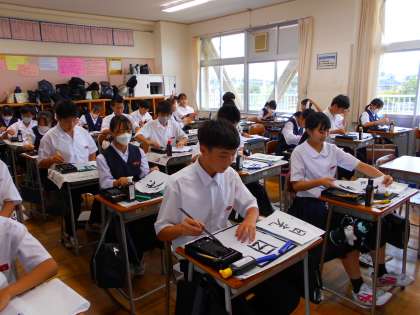 統一学校公開日・その3 公開日 2023/09/23 更新日 2023/09/23 統一学校公開日2023 9月23日(土) 5限 墨の香りの中で、集中して筆を進めています。 数学の問題を解こうとする一生懸命な姿も見られました。 よい雰囲気で頑張る1年生です。 (写真 上:1年4組 国語「書写」) (写真 中:1年5組 数学「Xについての方程式」) (写真 下:1年5組 数学「方程式を利用して文章題を解こう」)