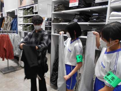 2年・14歳の挑戦・1日目・その20 公開日 2023/09/25 更新日 2023/09/25 2学年 9月25日(月) 午後 「社会に学ぶ『14歳の挑戦』」の活動を紹介します。 「ジーユー富山天正寺店」での活動のようすです。 指導ボランティアの方に、商品整理の仕方を教わっています。 丁寧にたたむために、お話をしっかりと聞いて頑張っています。