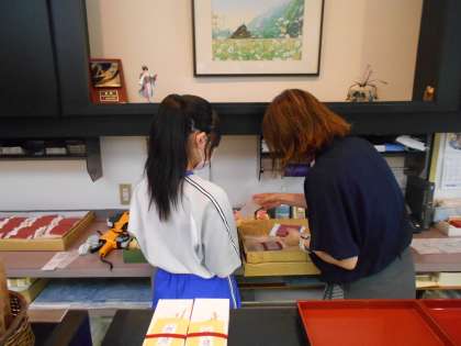 2年・14歳の挑戦・2日目・その4 公開日 2023/09/26 更新日 2023/09/26 2学年 9月26日(火) 10:00 「社会に学ぶ『14歳の挑戦』」の活動を紹介します。 「平安堂」での活動の様子です。 和菓子の箱詰め作業をしています。 集中力を切らさずに黙々と作業しています。