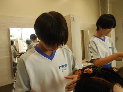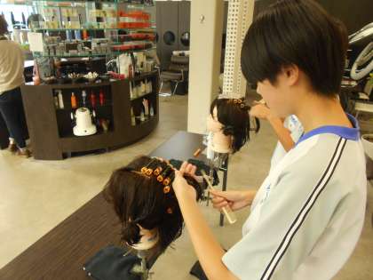 ヘアセットをスタッフの方にやり方を教えていただきながら練習しています。