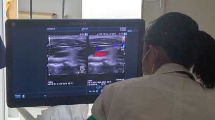実際に、エコーを使って首の動脈を見付けていました。