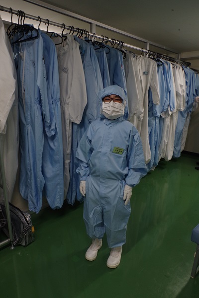 担当の方からは、「「車にはめる部品のため人の命を預かっています。埃一つでも部品につき誤作動することを防ぐためにも、防護服とマスクをキッチリ着てもらってます。」とお話ししていました。