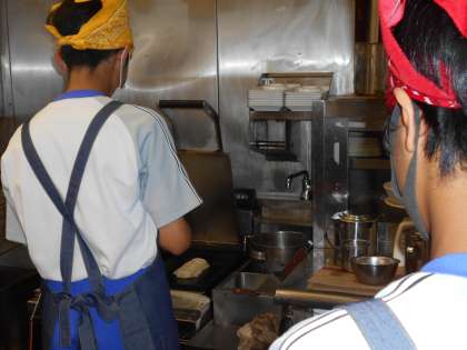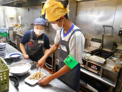 餃子を焼く作業を教わっています。