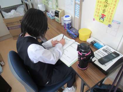 休憩中に「14歳の挑戦のしおり」に今日あったことの記録をしているところです。
