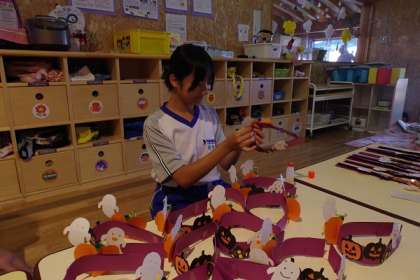2年・14歳の挑戦・3日目・その41 公開日 2023/09/27 更新日 2023/09/27 2学年 9月27日(水)14:00 「社会に学ぶ『14歳の挑戦』」の活動を紹介します。 「わかば保育園」での活動の様子です。 園児がお昼寝をしている間に、こっそりと10月にお誕生日を迎える園児の冠を作成中です。