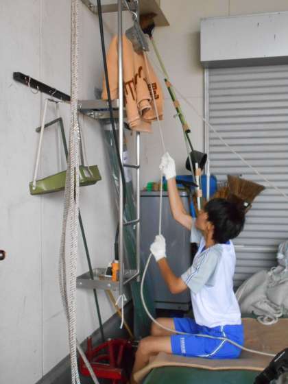 救助の際に使用する15cmほどあるおもりのついているロープを、座ったままで腕の力を使い、引っ張る訓練を行っています。