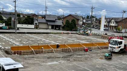 生徒玄関前に茶色の板に囲まれたところは、駐輪場にできる花壇になります。