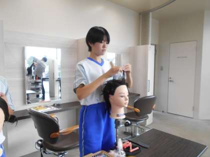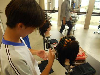 マネキンを生徒自身でてきぱきと組み立て、パーマ巻きの練習をはじめています。