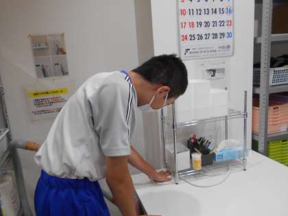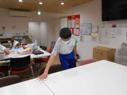 昼休憩の準備で台拭きをしています。