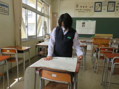 活動の様子を撮った写真を掲示するための台紙に、事業所名を丁寧に学年カラーの緑のペンで書いています。