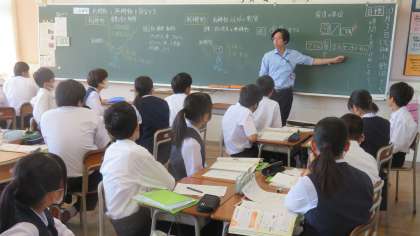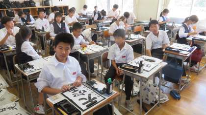 (写真 上:1年4組 国語・書写「大空」「日光」)