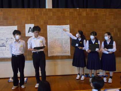 「よりよい社会について考えよう」をテーマに、修学旅行で学んだことを生かし発表を行いました。