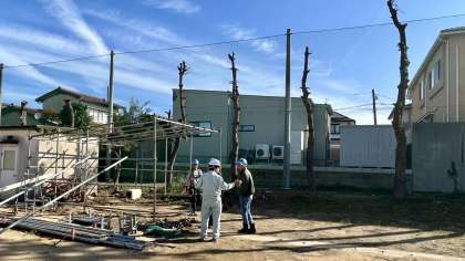 校舎東側の防球ネットがほぼ完成し、野球部のブルペン小屋の復旧作業に入っています。